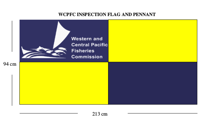 Paragraph 18 of the Procedures provides that “Authorized inspection vessels shall fly, in clearly visible fashion, the WCPFC inspection flag as designed by the Commission.”The below design was approved by WCPFC4.